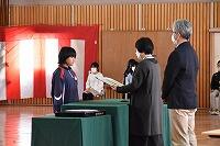 いつもの表彰集会と違って、赤じゅうたんの上を歩くので、ちょっと緊張した面持ちでしたが、さすが6年生はっきりした返事と堂々とした姿勢、立派な態度に感動しました