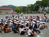 5月8日(火)、運動会の全体練習が始まりました。今日は一回目ということで、服装や整列の仕方などを確認したあと、みんなでラジオ体操を練習しました。昨日の雨で、校庭には水たまりがあったのですが、業間活動の前に6年生がスポンジで水取りを行い、無事に練習を終えることができました