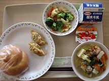 今日の給食のメニューは、「ミニ米粉パン 牛乳 揚げぎょうざ ちゃんぽん麺 ブロッコリーとカリフラワーのサラダ アセロラゼリー」でした。