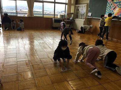 1年間、過ごしてきた4年生の教室ともうすぐお別れです。お世話になった教室をきれいにしようとワックスがけの前にみんなで大掃除をしました。机や教卓、大型テレビなど、教室にあるものを廊下に出し、隅々まで水拭きを行い、ゴミもきれいにとりました。