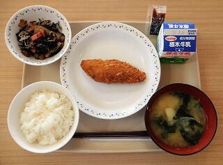 今日の給食は、ごはん、ひじきごはんの具、牛乳、白身魚フライ、じゃがいものみそ汁です。