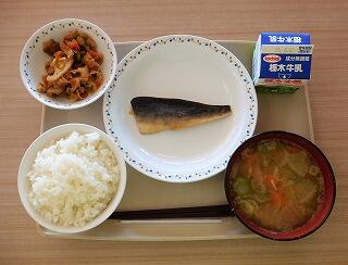今日の給食は、ごはん、ちらし寿司の具、牛乳、マホッケの塩焼き、根菜のごま汁です。