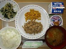 今日の給食のメニューは、「三色丼(鶏そぼろ、コーン、ごまあえ) 牛乳 白菜と油揚げのみそ汁 ブルベリーゼリー」でした。