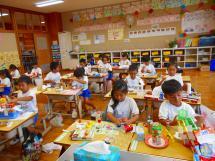 今日の「鮭のマヨネーズ焼き」は、みじん切りにした玉ねぎとマヨネーズ、粉チーズを混ぜて作った特製ソースを鮭の上にかけ、オーブンで焼きました。とても時間がかかる料理ですが、苦労をおしまず、手間ひまかけて一つ一つ手作りしています。とてもおいしく、みんな完食でした。食べ終わったアルミカップを、たたんでキレイに片付けると、調理員さんに作ってくれた感謝の気持ちが伝えられますね。