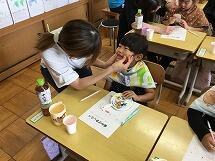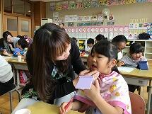 今日は、1年生の親子活動でした。歯科衛生士さんに正しい歯の磨き方を教えていただき、カラーテスターを使って、どこが赤くなっているのかを親子で確認し合いました。「歯の隙間が赤いね。」「ここも赤いね。」と言いながら、真剣に歯を見ていた1年生でした。それから、学校医の古澤先生からも歯についての講話をしていただきました。これからも、しっかりと歯を磨いて、健康な歯にしていきたいと思います。その後は、親子で給食を食べました。笑顔いっぱいの1年生でした。