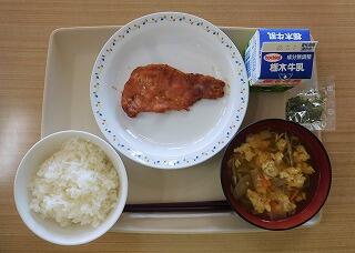 今日の献立は、ごはん、牛乳、栃木市産豚ロース肉のねぎ味噌焼き、かみなり汁です。