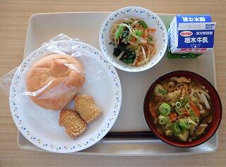 今日の給食は、お魚ドッグ、牛乳、ヘルシーサラダ、コーンポタージュです。