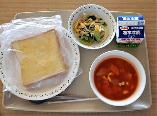 今日の給食は、シュガートースト、牛乳、チキンビーンズ、小松菜とコーンのサラダです。