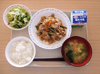 今日の給食は、ごはん、牛乳、岩下の新・しょうが焼き、昆布漬け、とうふとえのきのみそ汁です。
