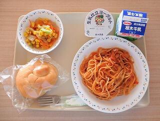 今日の給食は栃木市産のトマトをたっぷり使った、トマトとベーコンのスパゲティです。トマトについて詳しくはちょこっと食通信を見てください。ヘルシーサラダは、その名の通りこんにゃくの入ったヘルシーなサラダです。こんにゃくは、カロリーが低く、おなかの中をきれいにしてくれます。野菜と一緒にたくさん食べてください。