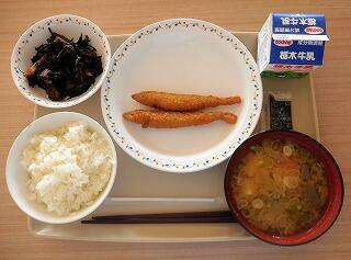 今日の給食は、ごはん、牛乳、ししゃもフライ、大豆の磯煮、豚汁です。