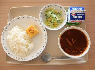 今日の給食は、ごはん、ハヤシライス、牛乳、とち介厚焼き卵、ゆで野菜サラダです。