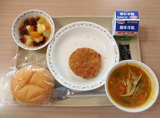 今日の給食は、ハムカツサンド、牛乳、もやしのカレースープ、ぶどうのジュレポンチです。