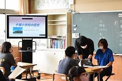 教頭先生が調べた千塚小の歴史と、6年生が総合学習で調べたことをパワーポイントにまとめて、全校生に紹介しました。初めてできた校旗は、保護者の方々の手作りだということがわかりました。すばらしいですね!