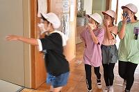 ↓↓ 「家庭科室から火災発生」「避難 開始」という合図で、帽子をかぶってハンカチを口に当てて校庭に避難します。