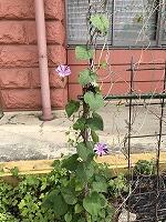 ↓↓ 職員室の南のベランダに、グリーンカーテンがあるのですが、昨年のこぼれ種から芽を出した朝顔が、花を咲かせました。