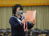 また、2年生は立志に際し各自が作文を書きましたが、各クラスの代表生徒がその作文を発表しました。「けがに苦しみながらも今の自分にできるたくさんのことに気付き、多くの人と関わり合いながら人にいい影響を与えられる人になりたい。」「相手の気持ちを理解することを心がけながら、笑顔を大切にし、ウエディングプランナーとして幸せを誰かに届けたい。」「剣道で経験した一本の責任の重さとその一本が自分にとって勇気になり、自信となり、心を支えてくれたということ。その一瞬を大切にしたい。」等、将来の夢や目標のこと、それに至るまでの経験や考えなどをそれぞれらしい表現で発表しました。