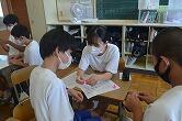 3年生の数学の授業では、2次方程式の解法について学習をしていました。「同じ方程式でも解き方はいろいろある。その方程式の特徴から適当な解き方を使って解く」という学習で、生徒が解き方を説明したり、練習問題では解き方を一緒に考えて確認したりしていました。力を伸ばしていってほしいです。