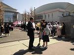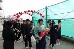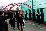 心を込めて歌った後は、校長先生を囲んで記念撮影。その後、生徒が作ったアーチをくぐってくださいました。