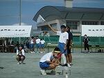 この的の穴に向かい、5m離れたところから、各自2球、玉を投げ込みます。