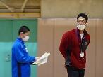 指導員の方が会場にお見えになりました。係の生徒が先導しています。お二人のご着席後、開会の言葉。