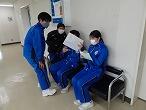 講習用の器具は限られていますので、1組の生徒が器具を使って講習している間に、2組の男子は救急救命法についての講話を聞き、途中で交換します。また、実技をする場合も、3~4人で6グループを編成、グループ毎に実技演習を行いました。