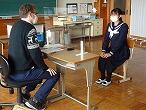 そして、3年生はその後、英語のスピーキングテストがありました。いつも学校に来ているALTの先生ではない、別のALTの先生が2名来校されました。事前に原稿にまとめて準備したことを基に、ALTの先生と話をする訳ですが、やっぱり緊張してしまったようです。それでも、ALTの先生と英語を話すことを楽しんでいる姿が見られました。ALTの先生からは、去年よりずっと上手になっていると、本校の英語の先生にコメントがありました。