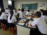 1年生の社会の授業、一所懸命先生の説明を聴いてノートをとっています。英語の授業でも生徒は丁寧にノートを整理していました。先生からの問題に、「答えは何?」友達と相談して頑張っていました。