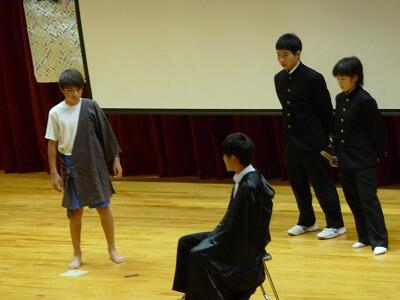 人権に関するお話の後、代表生徒による高齢者疑似体験学習を行いました。体験学習を行った生徒からは、「高齢者