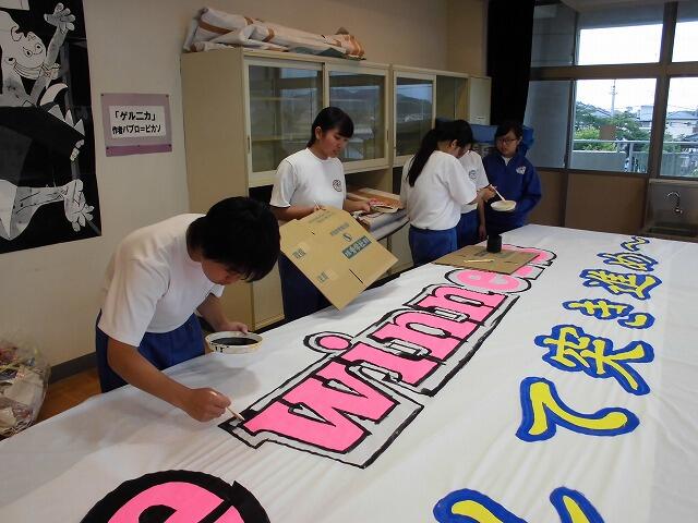 6/13(土)の体育祭の成功を願い、美術部員が心を込めて体育祭スローガンの横断幕を作成して