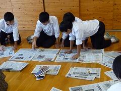 新聞の構成や読み方についてのお話の後、新聞スクラップのつくり方について説明がありました。その後、生徒は、興味のある分野の記事を選び、楽しみながら新聞スクラップづくりに取り組みました。新聞に親しむよい機会となりました。