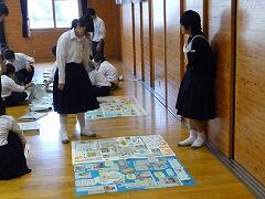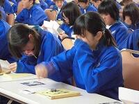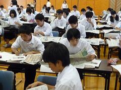 新聞の構成や読み方についてのお話の後、新聞スクラップのつくり方について説明がありました。その後、生徒は、興味のある分野の記事を選び、楽しみながら新聞スクラップづくりに取り組みました。新聞に親しむよい機会となりました。
