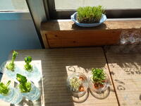水耕栽培で使う野菜とペットボトルを買いに、スーパーに買い物学習に行きました。計算機を使うことで予算内に買い物をすることができました。「税込み・税抜き」の勉強にもなりました。店員さんともコミュニケーションを図り、スムーズに買い物ができました。今回、水耕栽培に挑戦する野菜は人参、大根、小松菜、豆苗、カイワレ大根です。日の当たるところに置いたとろこ、早速豆苗は成長を見せてくれました。人参も新しい芽が出始めています。収穫が楽しみです。