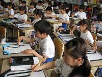 今日の3時間目、3年生は毛筆で「日」に挑戦しました。教室を広く使うために、隣の教室と2つに分かれてオンラインでつないで授業を行いました。今日も4名のアシストネット、Sサポのボランティアの先生方が支援してくださいました。