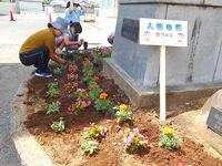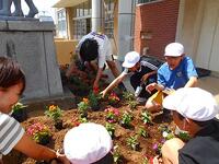 今回、植えた花は、パンジーとビオラです。その他にも、ブルーサルビアが植えてあります。児童は声を掛け合いながら、楽しそうに花を植えていました。これから、各クラスで世話をして、花がぐんぐん元気に育っていくといいなと思います。