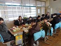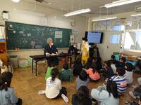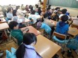 今年度の学校行事や学校評価について、ご意見をいただいた後、全クラスの授業を参観していただきました。タブレットでパワーポイントにまとめて発表していた様子をご覧になり、子どものスキルの高さに驚かれていました。今回は、1年生、6年生のクラスに入って、給食の時間も子どもたちといっしょに過ごしていただきました。