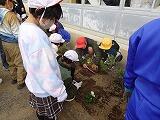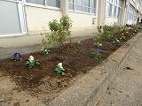 今回、植えた花は、パンジーとビオラです。その他にも、ブルーサルビアが植えてあります。児童は声を掛け合いながら、楽しそうに花を植えていました。これから、各クラスで世話をして、花がぐんぐん元気に育っていくといいなと思います。