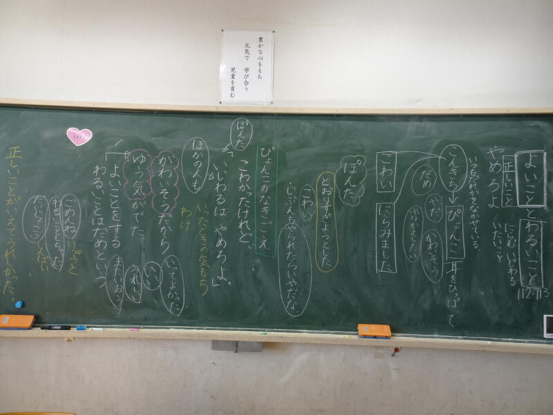 今回、道徳の授業では、いじわるをしている友達に、「いじわるはやめろよ。」と、言うことができたぽんたの気持ちを考えました。言うまでには、様々な葛藤がありますが、「かわいそうだから勇気を出せた。」「言ってよかった。」など、正しいことをしてうれしかった気持ちを想像することができました。そして、これからは、勇気を出して正しいことをしよう、という考えをもつことができました。