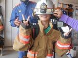 重たい防火衣を着て、タンクを背負わせていただき、子ども達はよろよろしていました。