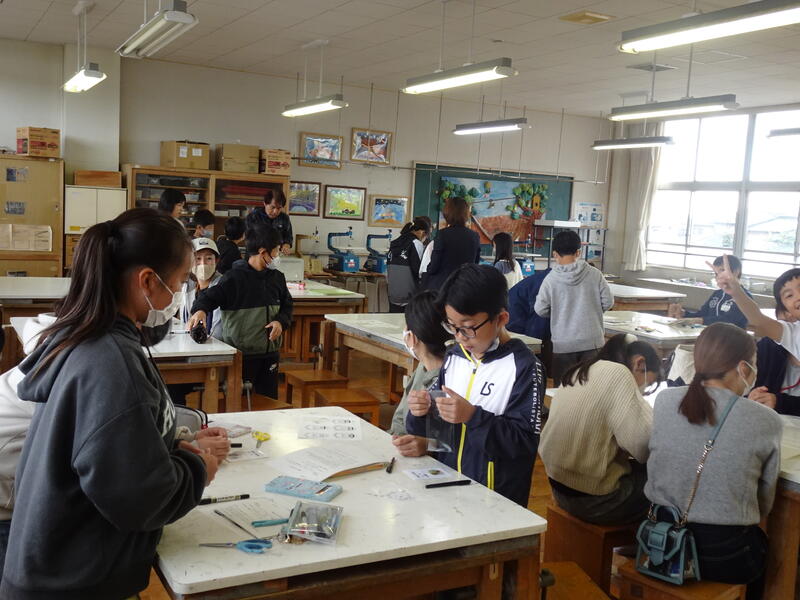どんなデザインの藤郎マグネットにするか、親子で相談したり、ていねいに色を染めたり