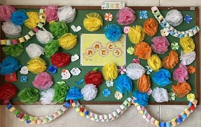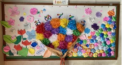 どの学年も、ひとつひとつていねいに心をこめて折った折り紙や花などを使い、デザインを工夫しています。