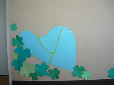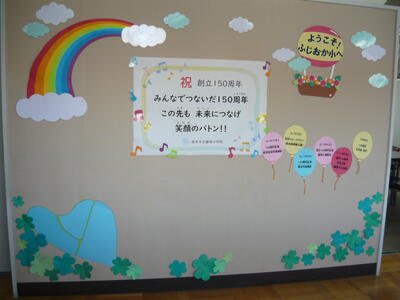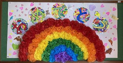 校舎内の掲示板には、各学年で作製した掲示物が掲示され、ありがとうの気持ちを伝えています。