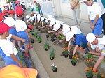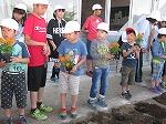 今日は花いっぱい運動の日です。栽培委員会の皆さんからお花を紹介してもらいました。そのあと、低学年は高学年に手伝ってもらって、苗植えです。サルビア・マリーゴールド・日日草、花壇はすっかり夏に模様替えです。また、学年ごとにサツマイモの苗も植えました。大きなおいもが収穫できるように、心を込めて植えました。根がつくまで、水やりもがんばります。