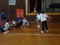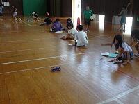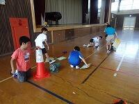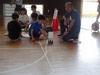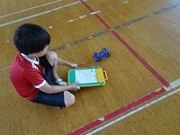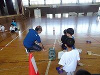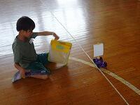 体育館いっぱいに巻尺が固定され、帆をつけた車に送風機で風を当てる強風コース、弱風コース、輪ゴムを伸ばす長さ5cm、10cm、15cmのコースが用意されました。子供たちは、予想を立てて、実験開始です。「先生、14mもいったよ」「6m30cmだ」子供たちは目盛りをよむと、ワークシートに書き込んで、次々と実験を進めていました。