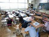 今回は,地震が起きた後、普通教室から火災が発生したという想定で避難訓練を実施しました。雨天のため集合場所は体育館となりましたが、避難終了後、消防署の方のご協力により、煙体験テントで煙の被害の疑似体験を行いました。テントの中は煙に包まれて、前が見えないほどでした。災害遭遇時に生かせるよい体験となりました。