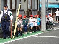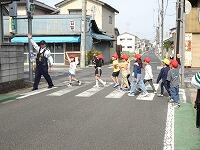 歩道の歩き方、横断歩道の渡り方、信号の見方や注意など、実際の道路で、確認しながら安全な歩き方を教えていただきました。登校班でも安全に気を付けて、自分の命を守れるよう、今日教えていただいたことに気を付けて、登下校してください。警察署の皆様、お忙しいところ、ありがとうございました。