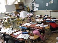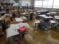 前回避難訓練の時に教わった”机の下に潜る”、”机は対角線に持つ” といった約束を忘れずに行えています。 その後も[お・か・し・も]を守り、素早く移動することができました。
