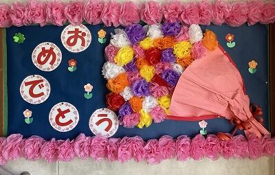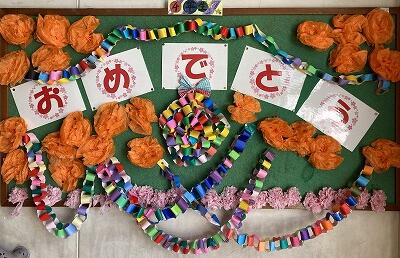 どの学年も、ひとつひとつていねいに心をこめて折った折り紙や花などを使い、デザインを工夫しています。