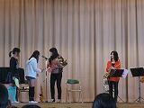 10/12(水) 本日の午前中、体育館で音楽鑑賞会がありました。今回の音楽鑑賞会は、栃木市文化会館の事業の一環として行われました。今回の演目は「サックス四重奏」です。きれいな音色に癒やされながら、ジブリの曲や音楽の授業で合奏練習をしている曲の演奏を聴きました。曲名を聞いたたけでは分からない曲も演奏が始まると”知ってる”といった表情で楽しく聴いていました。また高学年の代表児童がサックスに挑戦する時間や低学年の代表児童が楽器に触れ体験する時間もありました。 保護者の方や地域の方もご覧いただき、楽しんでいただきました。サックスに合わせて歌った校歌もとても上手でした。芸術の秋にふさわしい一日になりました。