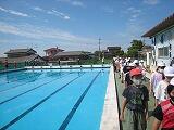 例年はプールサイドで行いますが、今年は、新型コロナウイルス感染症対策のため、校庭で行ったのち、学年ごとにきれいになったプールを見学しました。